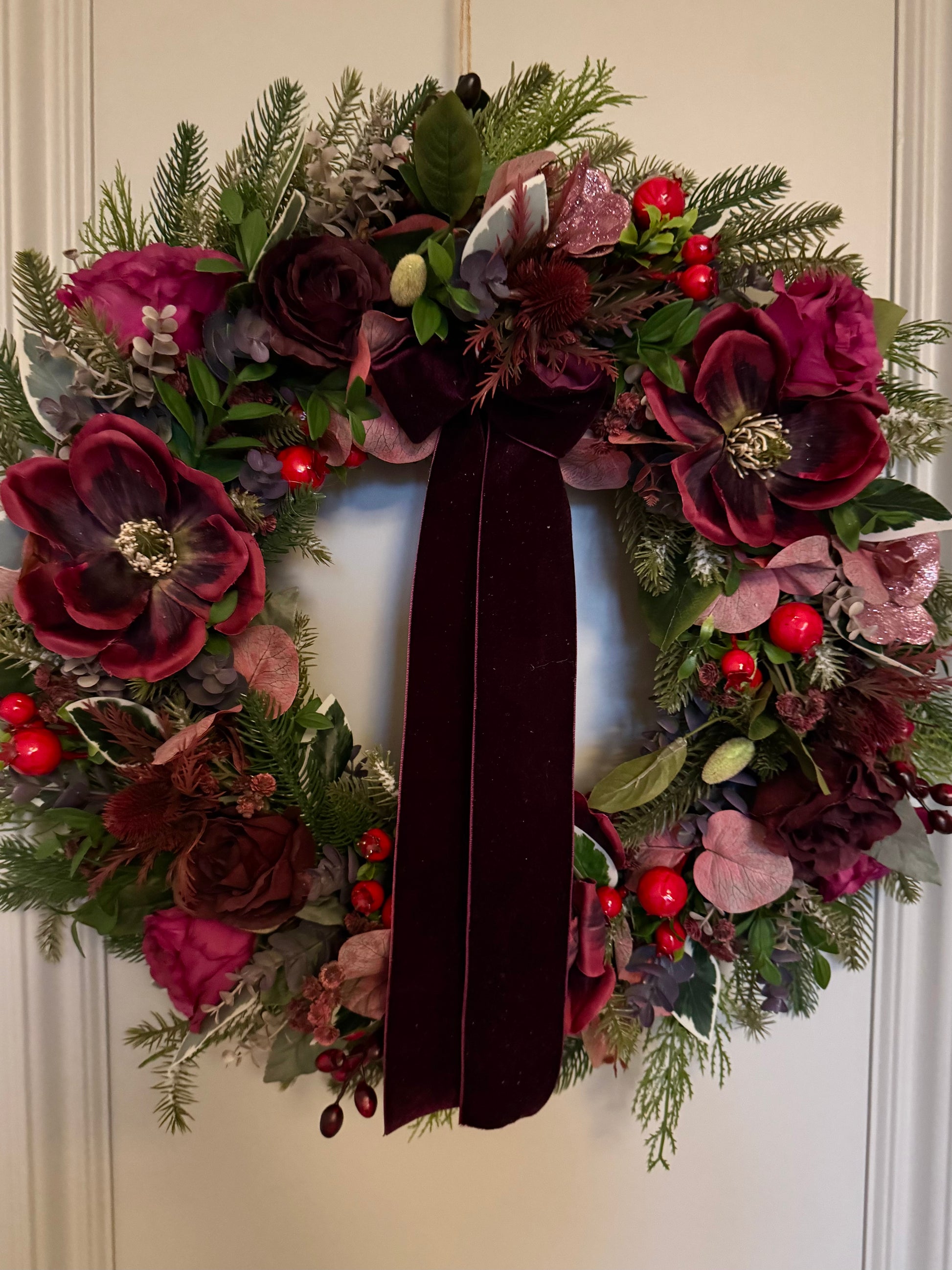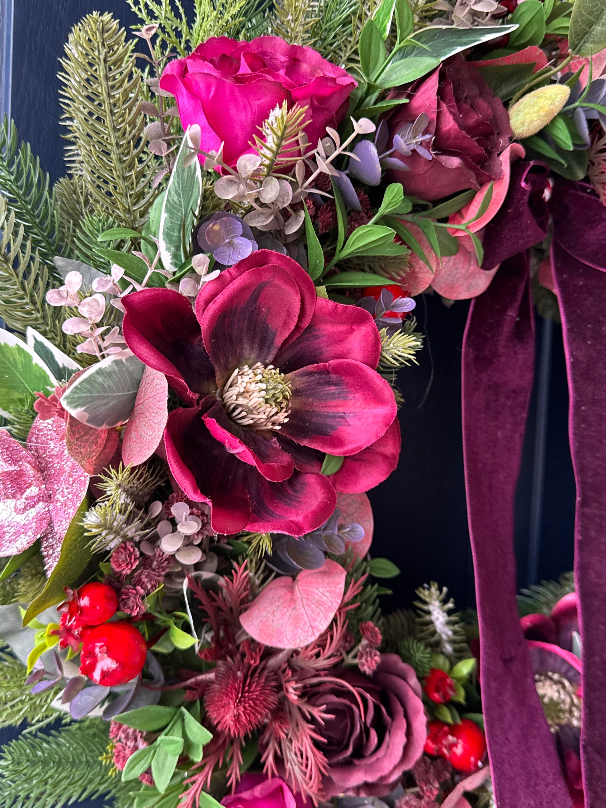 A rich elegant twist on Christmas classics. Deep plum, burgundy petals, berries and evergreens layer to bring depth and richness.