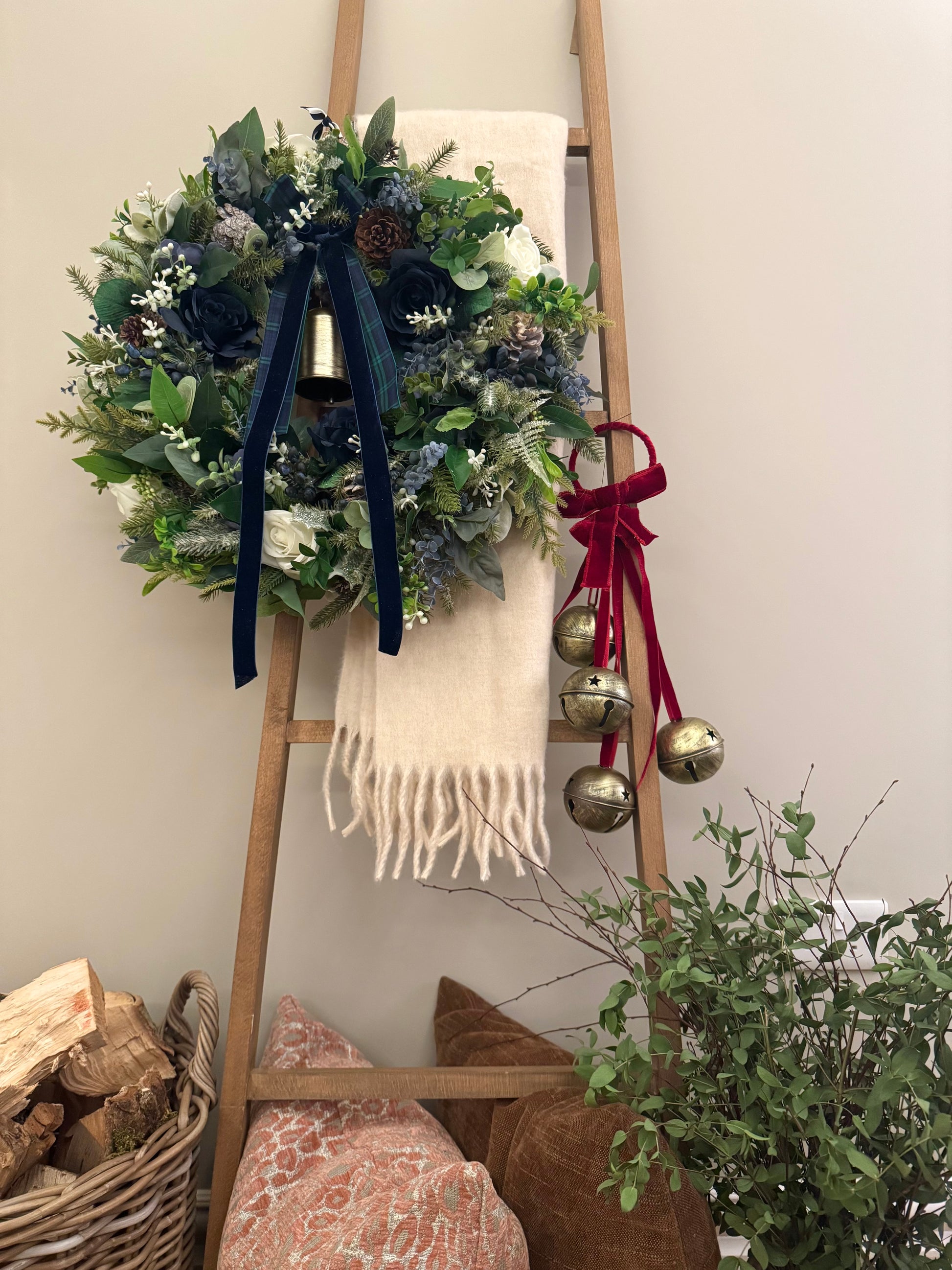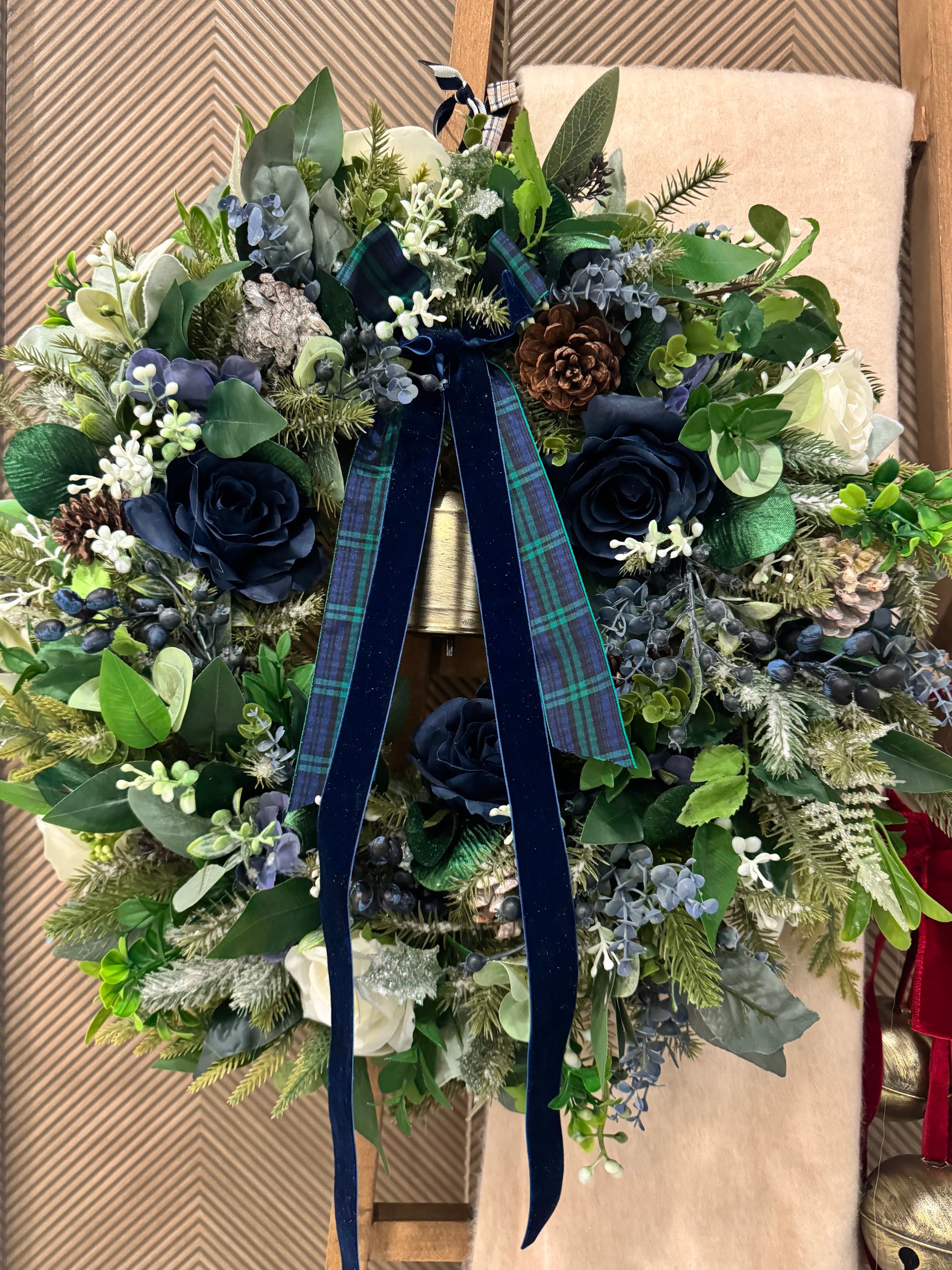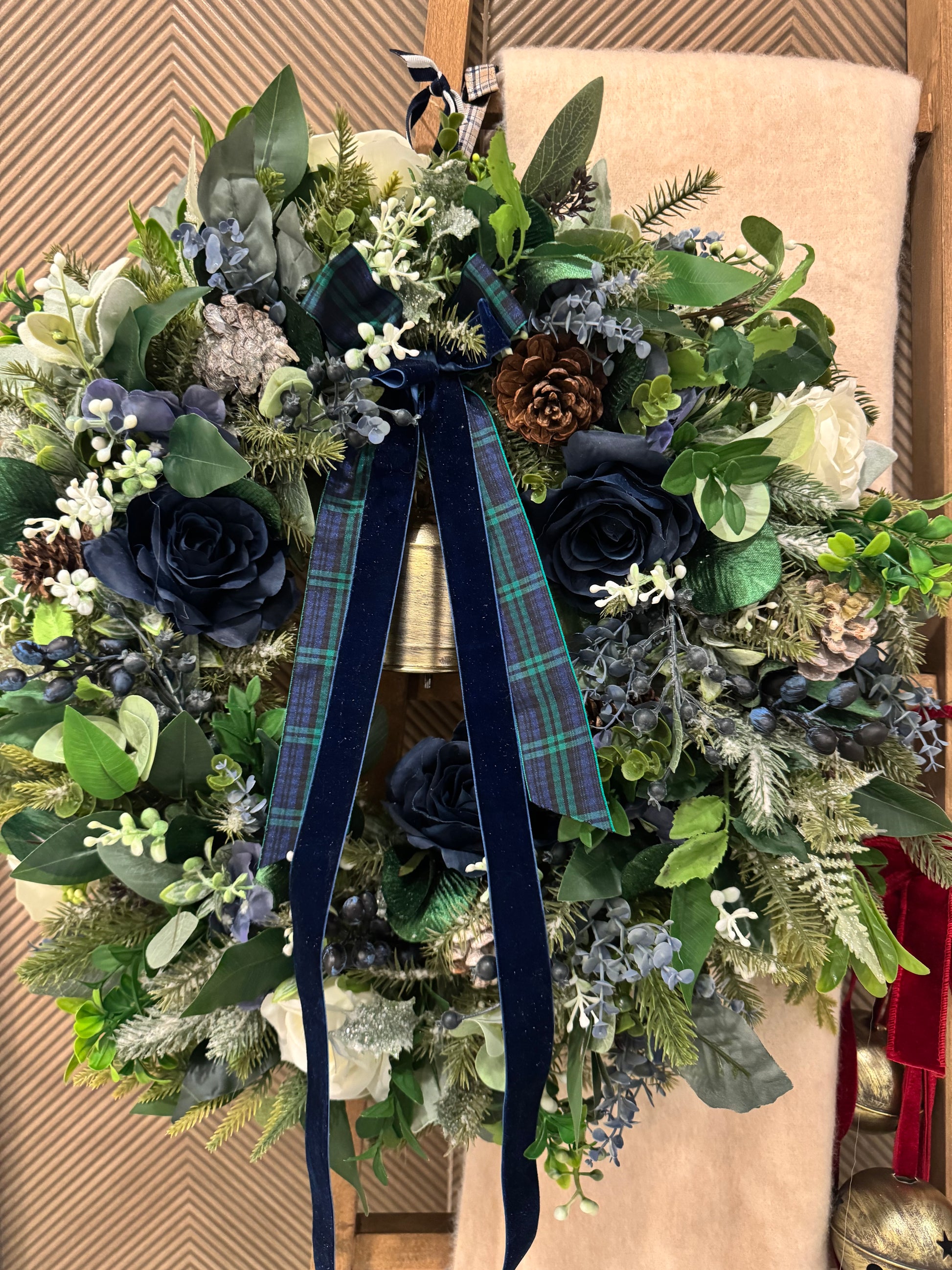 - Handcrafted faux floral wreath with deep navy blooms, frosted greenery and rich foliage paired with a traditional tartan and deep navy velvet bow.
