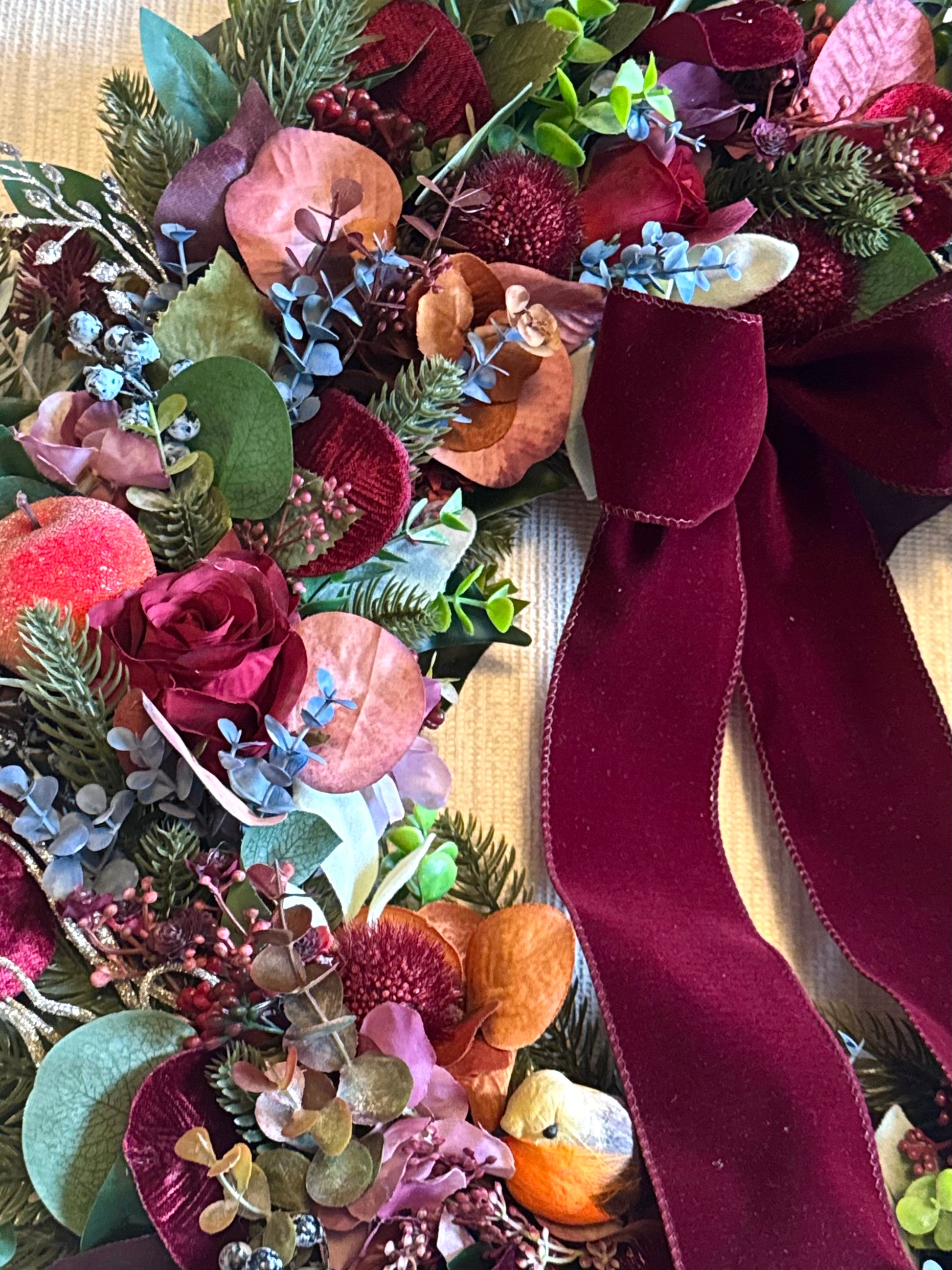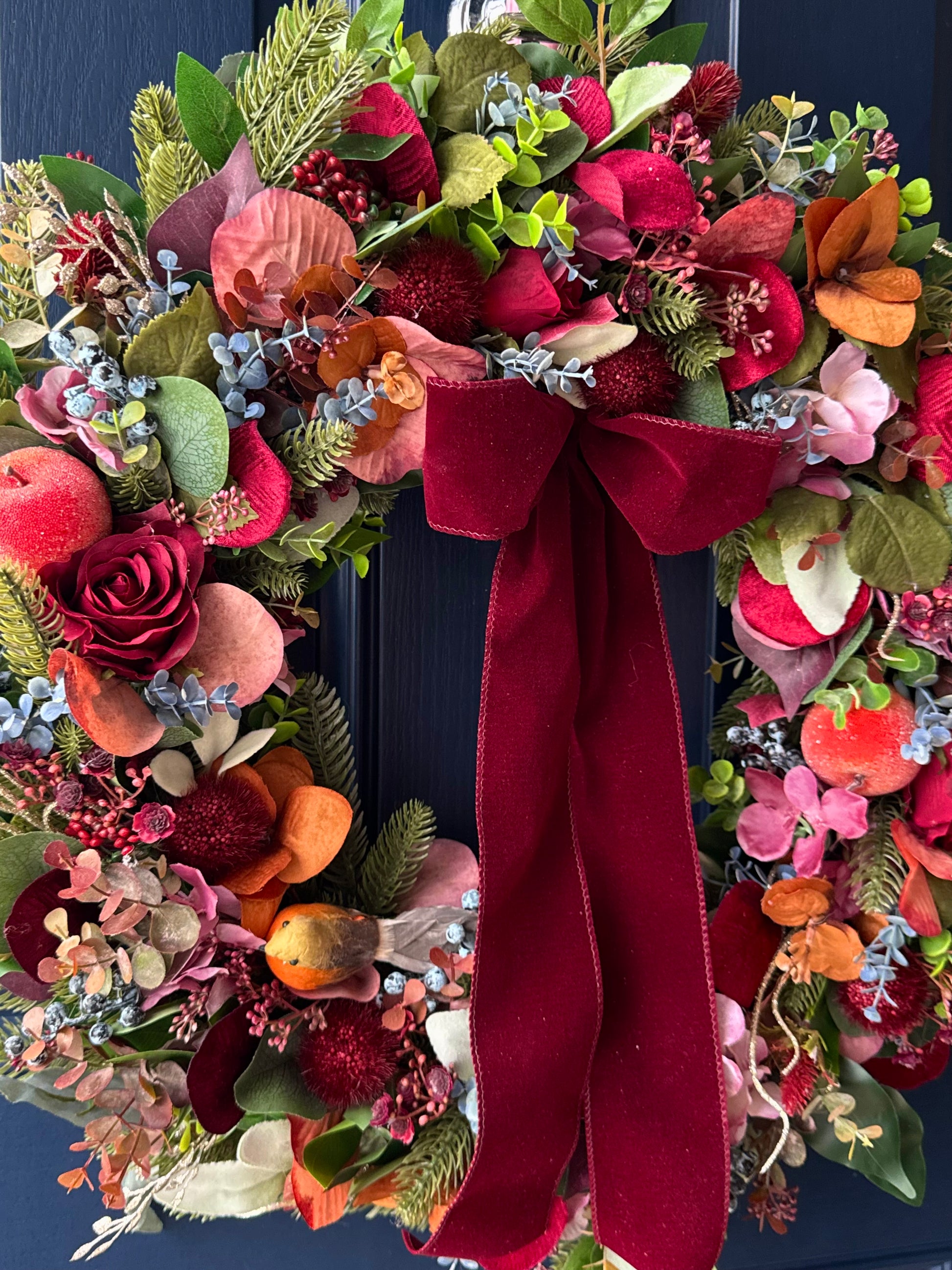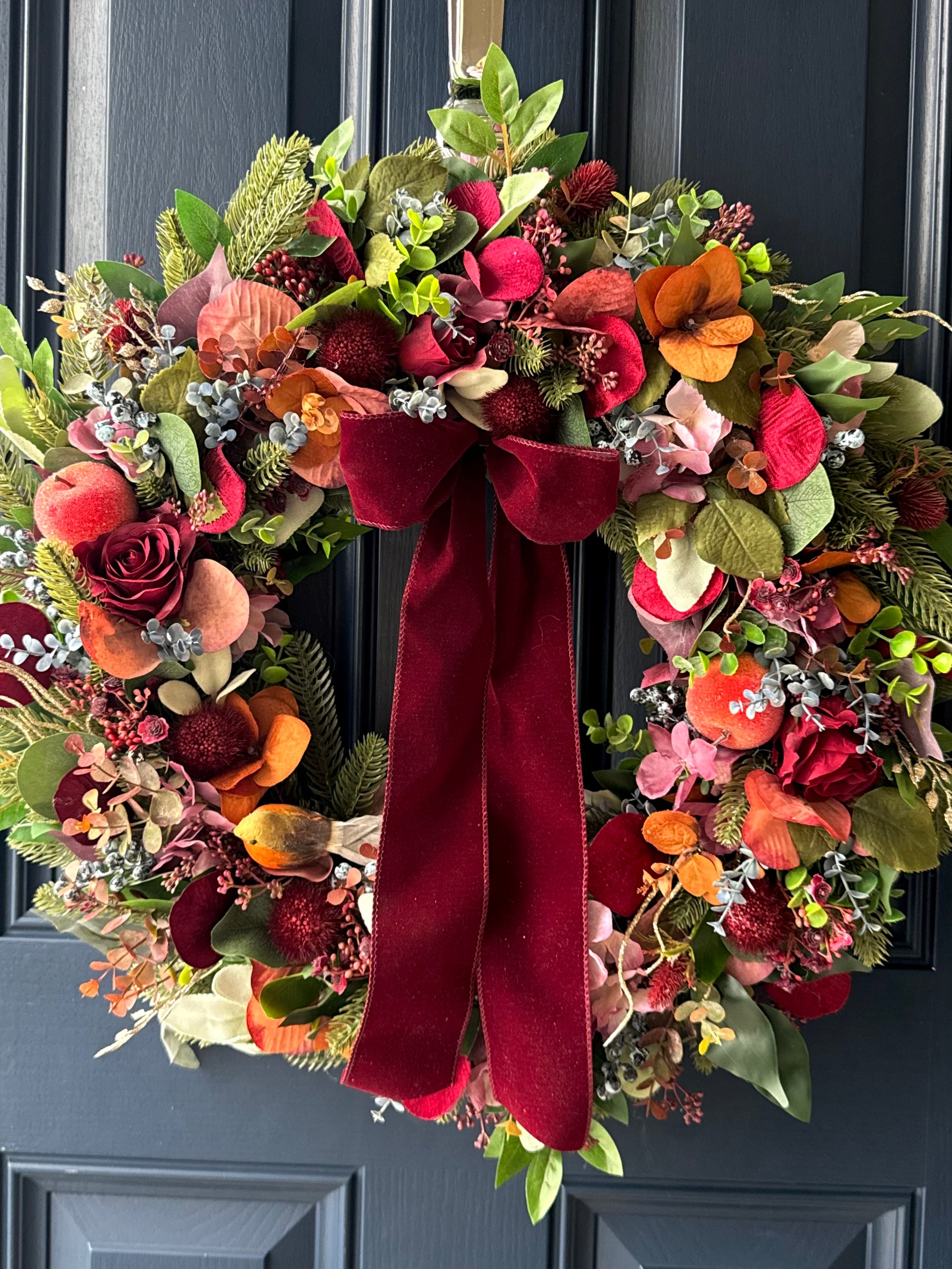 A blend of winter florals and berries combined with warm seasonal accents create this festive lux wreath.